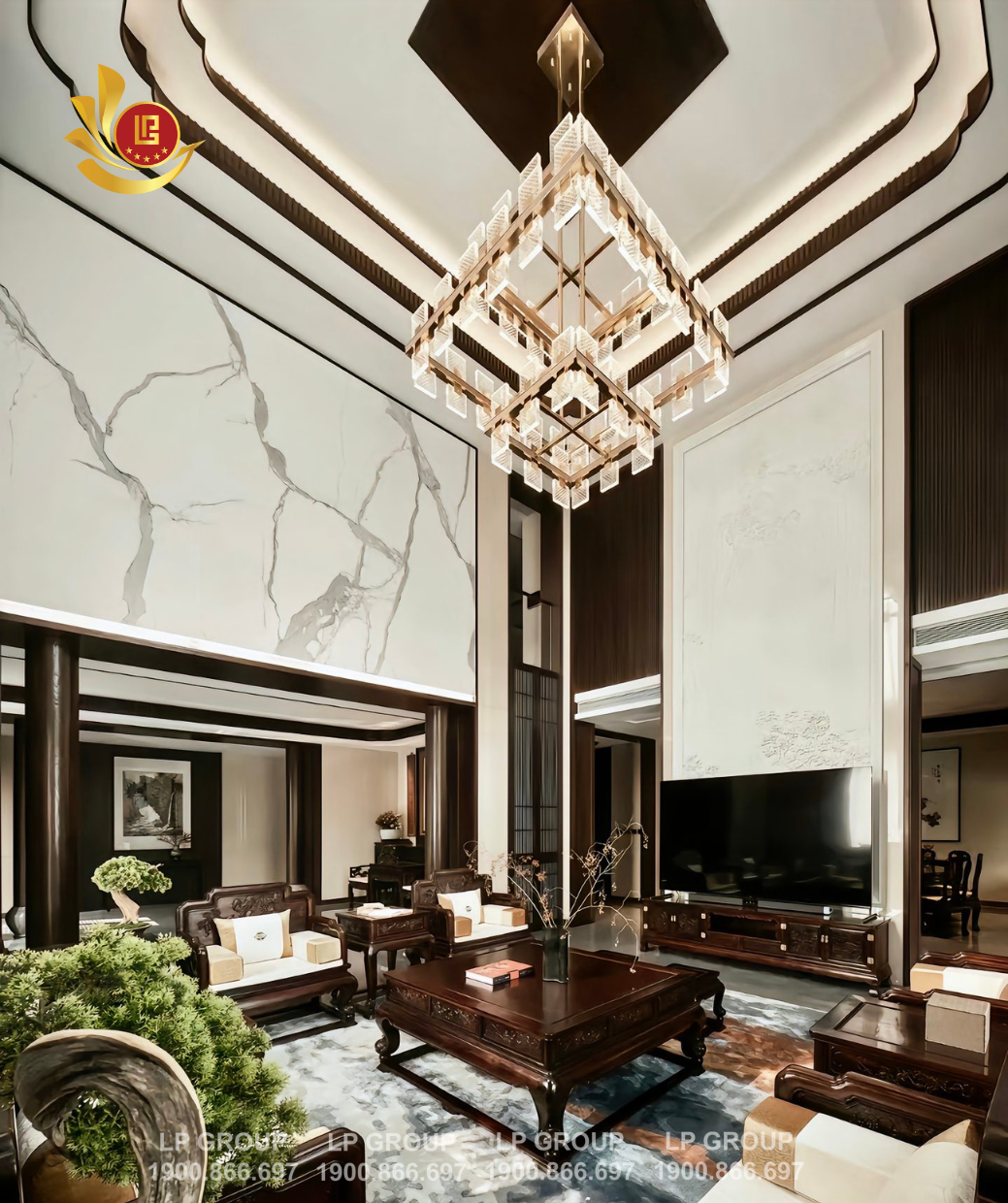 Thiết kế nội thất cao cấp này chịu ảnh hưởng mạnh mẽ từ phong cách châu Á đương đại, với đường nét tối giản nhưng tinh tế. Mỗi chi tiết, từ trần nhà, đèn chùm, đến bộ bàn ghế đều mang hơi hướng của nghệ thuật Á Đông nhưng được hiện đại hóa để phù hợp với xu hướng thẩm mỹ ngày nay. Phong cách này không chỉ tôn vinh nét văn hóa truyền thống mà còn mang lại một không gian sống thân thiện và gần gũi. Đặc biệt, các vật liệu tự nhiên như gỗ và đá được sử dụng một cách sáng tạo, tạo nên vẻ đẹp sang trọng và đẳng cấp cho căn phòng.