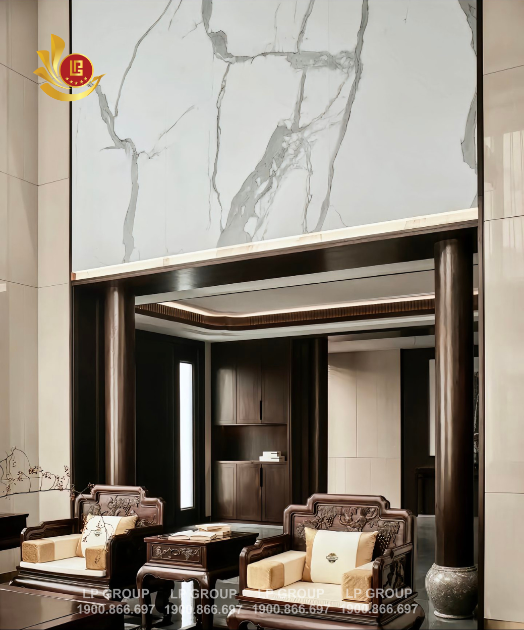 Các mảng tường lớn trong căn phòng là sự kết hợp tinh tế giữa gỗ tối màu và đá hoa cương. Sự tương phản giữa hai chất liệu này không chỉ tạo điểm nhấn cho không gian mà còn mang lại cảm giác rộng rãi, thoáng đãng. Đá hoa cương với các vân tự nhiên mang lại sự mới mẻ, thanh lịch, trong khi gỗ tối màu lại toát lên vẻ ấm cúng, gần gũi. Cùng với ánh sáng từ đèn chùm, các mảng tường này trở thành một bức nền hoàn hảo, tôn vinh sự tinh tế của từng món nội thất và tạo nên sự cân bằng trong bố cục không gian.